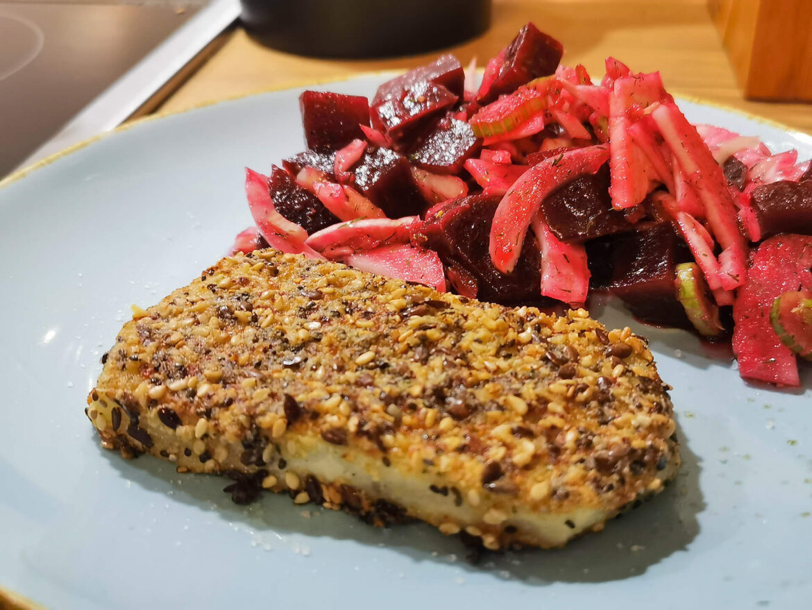 Ich habe für die Panade eine Parmesan-Mandelmehl Basis genommen und diese dann mit den Sachen erweitert, die ich so im Haus hatte. Leinsamen, Sesam und Chiasamen. Hier kann natürlich frei kombiniert, ausprobiert und resteverwertet werden!