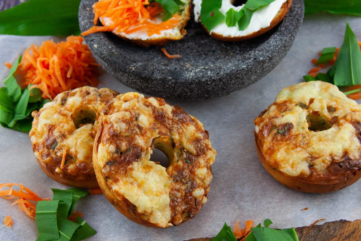 Diese Bagels sind saftig, würzig und leicht. Der ideale Brotersatz für’s Grillen oder für ein ausgeprägtes Wochenendfrühstück.