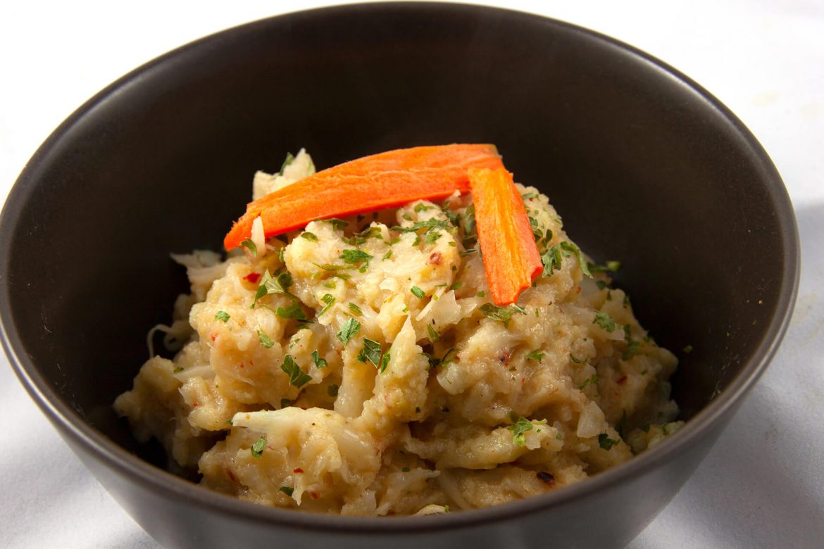 - Den Blumenkohl in den Topf geben und mit geschlossenem Deckel 15 bis 20 Minuten dämpfen, bis er sich gut zerstampfen lässt.