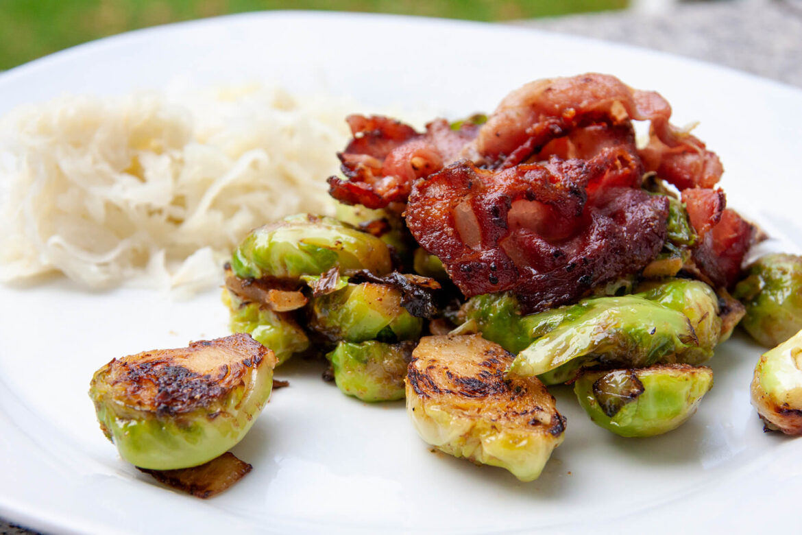 - Den Rosenkohl mit dem Bacon und den Zwiebeln auf einem Teller servieren.