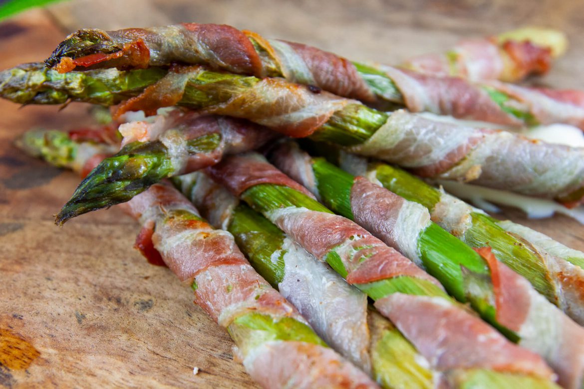 Eigentlich sagt der Name dieses Gerichtes schon alles aus, was man wissen muss. Es besteht auch tatsächlich nur aus diesen zwei Zutaten. Da der Bacon genug Salz und Würze mit sich bringt, sind noch nicht einmal Gewürze notwendig. Einfach ein Paket grüner Spargel und ein Paket Bacon und ein Messer, um den Bacon einmal längs durchzuschneiden und ihr seid startklar. Wenn ihr also mal unterwegs seid und spontan den Grill anschmeißen wollt, ist dieses Gericht perfekt. Am besten habt ihr dann allerdings noch eine Metalschale oder Pfanne für den Grill, da sonst das Baconfett ins Feuer tropft und es dafür an sich zu schade ist und das Grillen erschwert. Besser es umschmiegt den Spargel und macht ihn schmackhaft und lecker.
