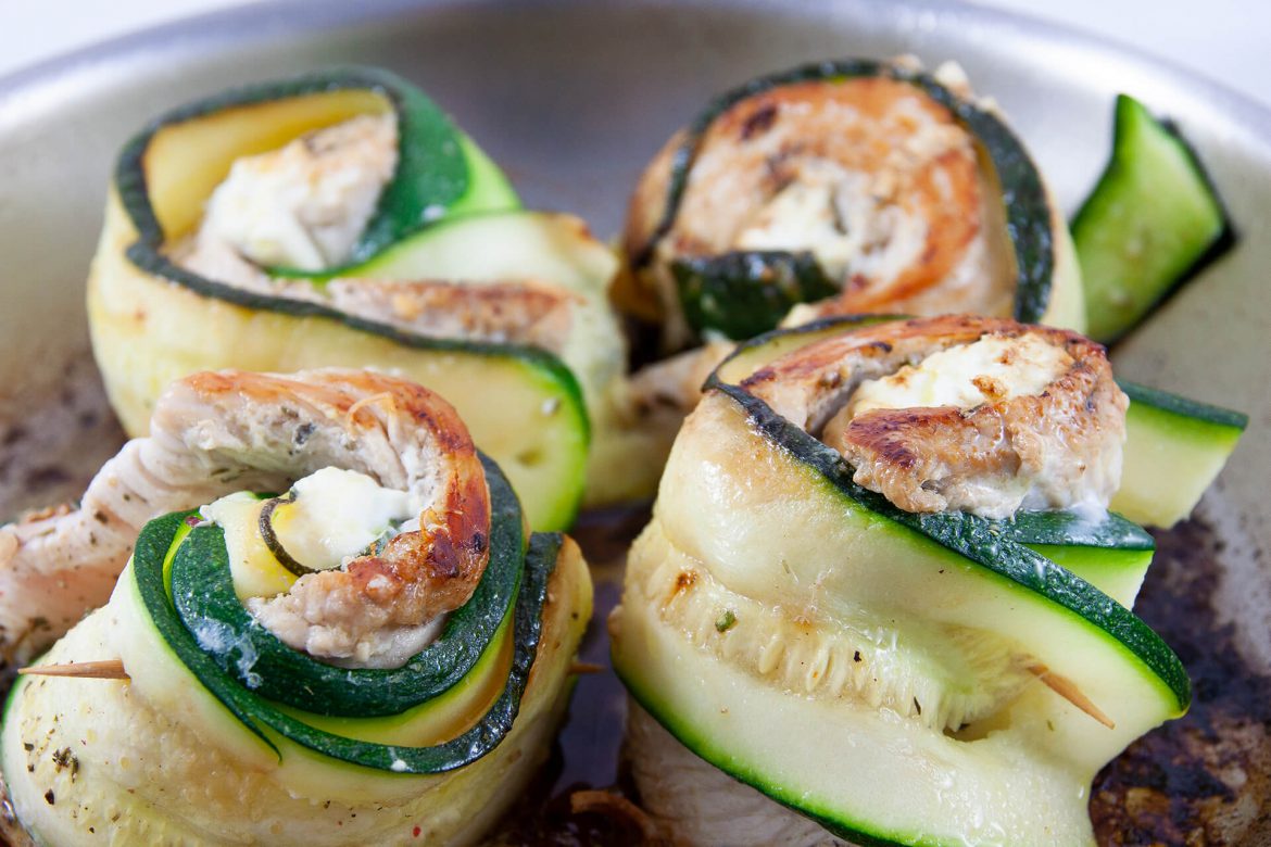 - Ein Hänchen-Schnitzel auf die entsprechende Menge Zucchini Streifen legen und einen Streifen Feta ans untere Ende legen. Nun stramm zusammenrollen und mit einem Zahnstocher fixieren.