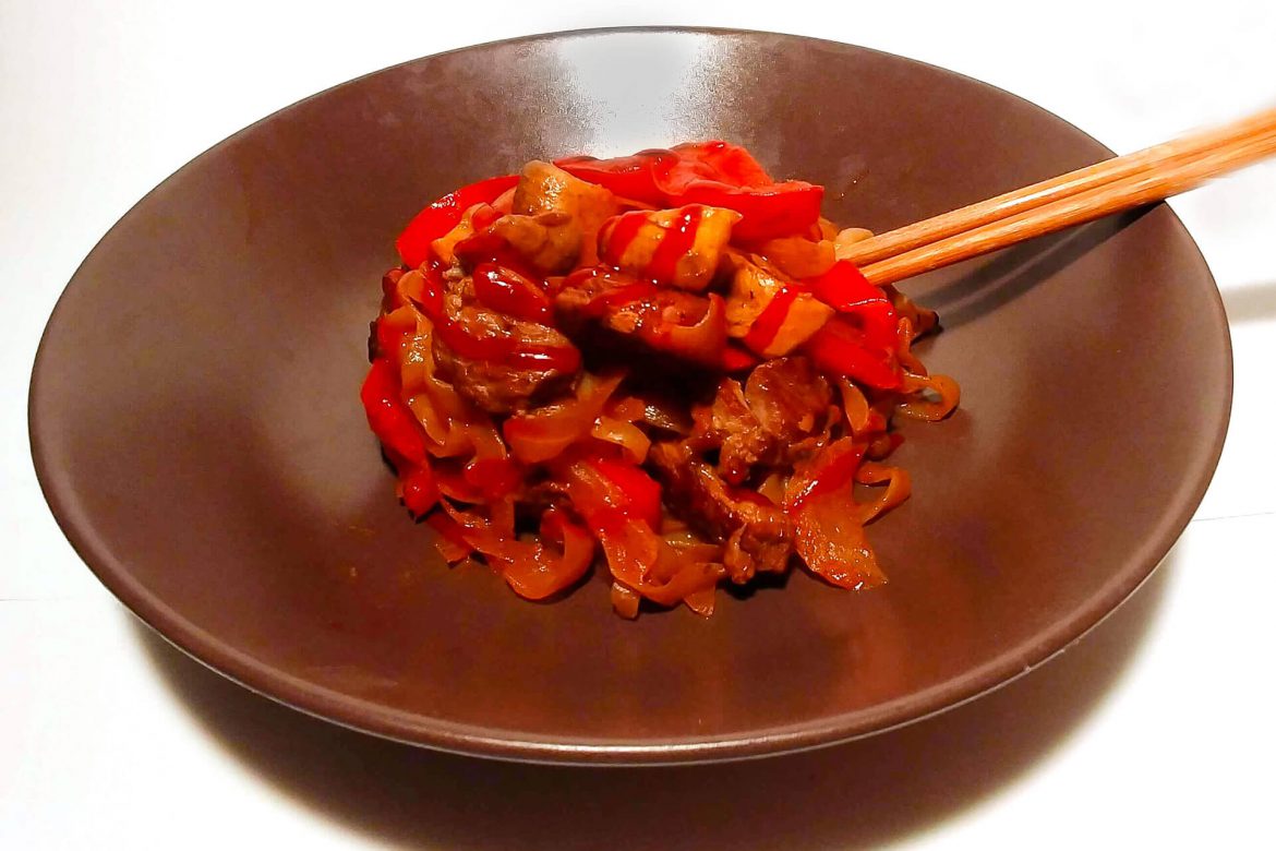 Ein schnelles und sehr leichtes asiatisches Gericht. Schön kräftig gewürzt und mittelscharf. Der ideale Einsatz für Shirataki Nudeln. (Infos zu den Produkten der Konjak-Pflanze findest du hier. Wenn ihr mit einem ganzen Hähnchen gearbeitet habt, könnt ihr die Haut, die ihr von dem hier verwendeten Fleisch abgezogen habt, vorher in der Pfanne zu leckeren Chips (für das Rezept hier entlang) auslassen und das Fett zum anbraten benutzen.