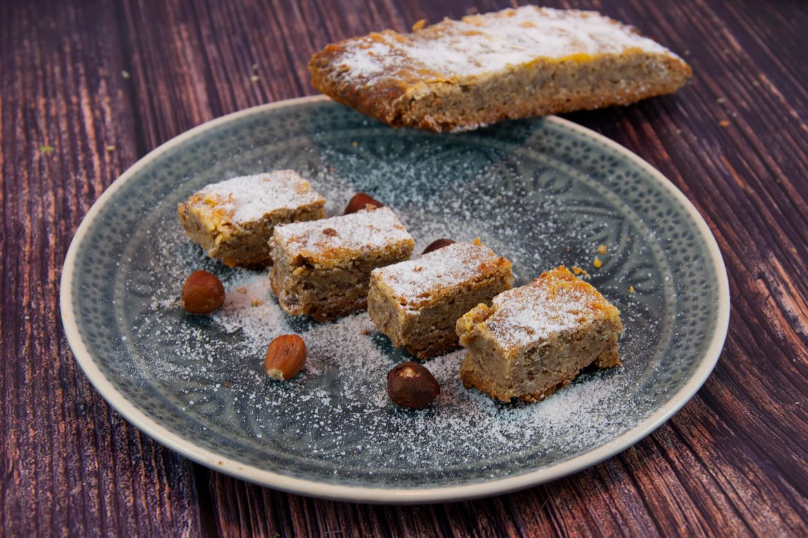 - Den gebackenen Teig herausnehmen, abkühlen lassen und zu Pralinchen schneiden.