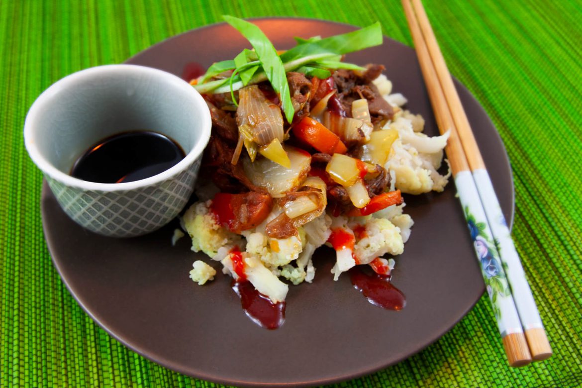 Auch wenn Fleisch perfekte Makros bei kohlenhydratreduzierter Ernährung hat, schadet es aus diversen Gründen auch nicht mal eine Mahlzeit durch Alternativen zu ersetzen. Bei diesem Rezept habe ich die Jackfrucht ausprobiert. Sie erinnert in der Textur an weiches Pulled Pork und kann sehr gut in die gewünschte Richtung gewürzt werden. Hier bin ich mit Koriander, Ingwer, Chili und Knoblauch Gewürzen in eine Asia Wok-Richtung gegangen. Dazu leckerer Blumenkohlreis – der geht immer!