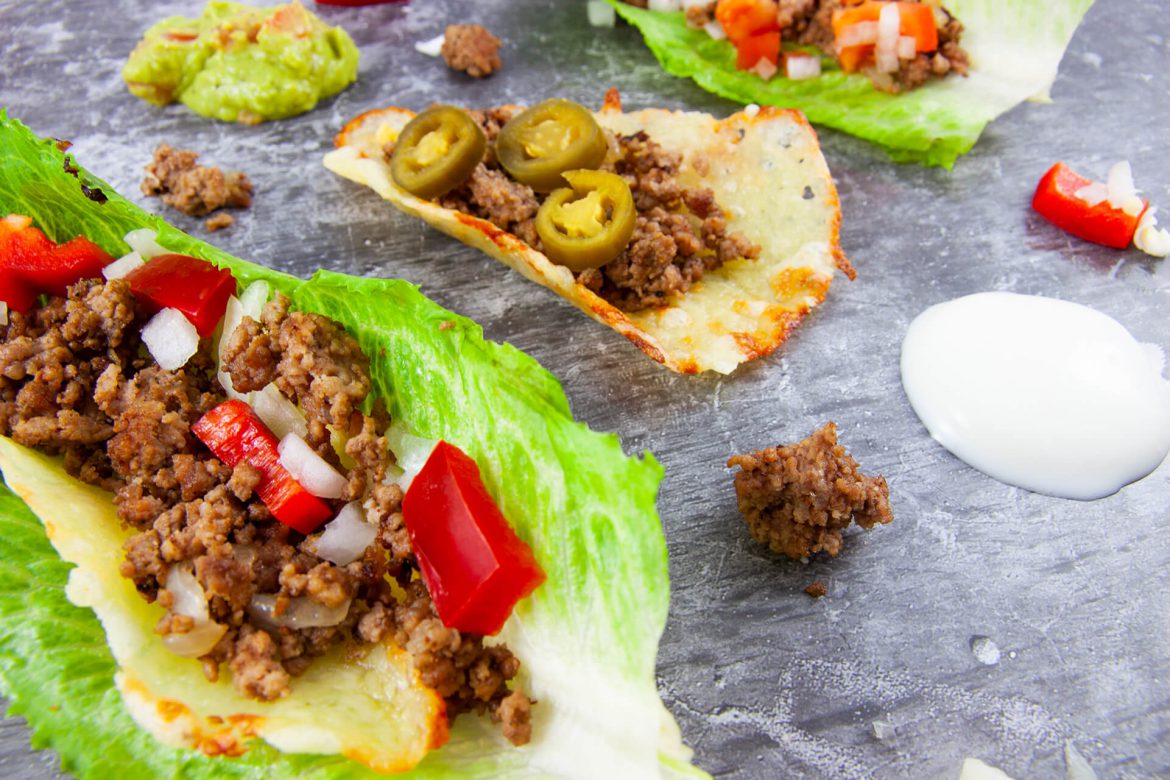 Was ist besser als knackige Romana-Salatblätter oder Käse als Tacos für leckeres Hackfleisch mit vielseitigen Toppings? Na Käse-Salat-Tacos! Während, ihr in Ruhe einige von diesen Tacos, ohne Reue, verputzt, könnt ihr euch jedes Mal aussuchen, ob ihr nun Käse, Salat oder einfach beides als Taco nehmen sollt. Dann schmeißt ihr einfach rein worauf ihr Lust habt: Hackfleisch, Zwiebeln, Paprika, Jalapenos, Mais oder worauf auch immer ihr Lust habt. Dazu Joghurt und Guacamole und das Gericht ist perfekt!