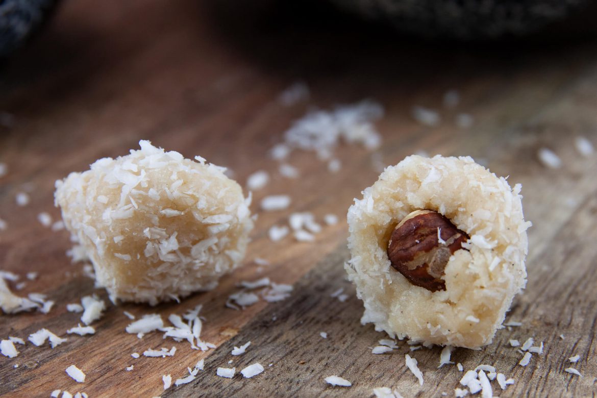 Hier habe ich mal letzteres gezaubert. Lecker-süße Pralinen mit tollem Kokosnussaroma und einem Nusskern. Ich habe Haselnüsse genommen, man kann aber natürlich auch Mandeln oder andere Nüsse nehmen!