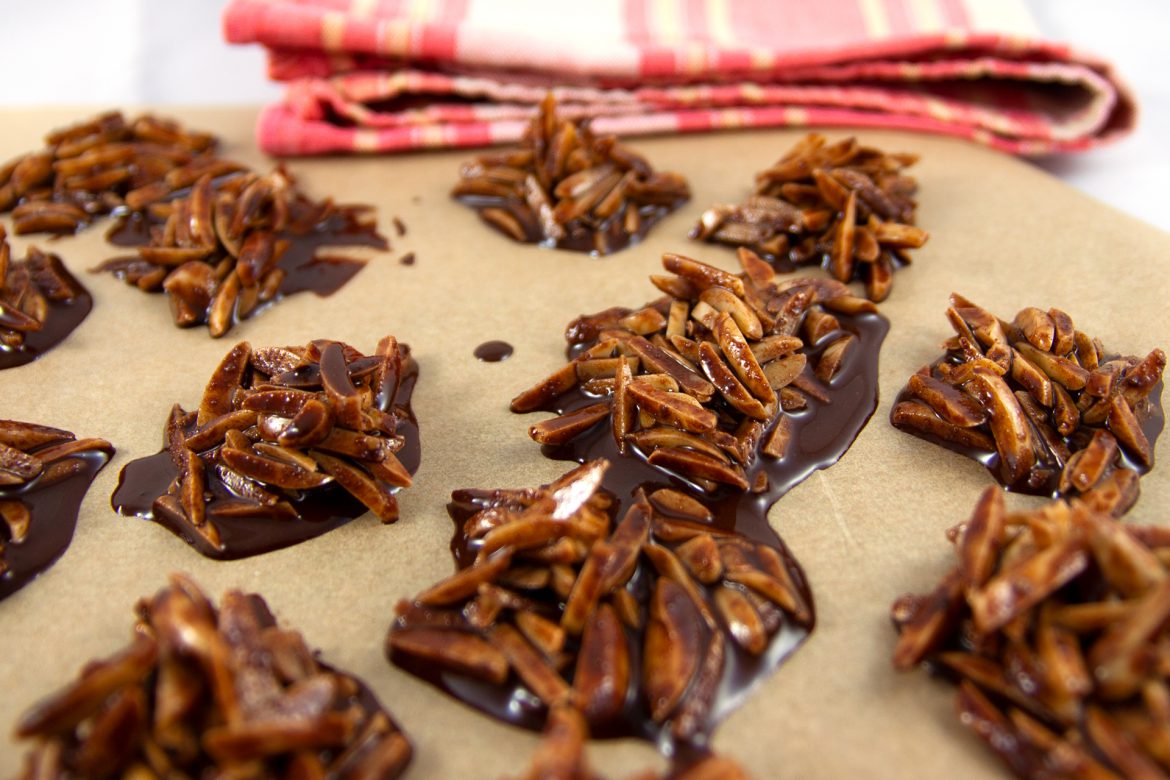 - Mandeln mit der Kakaomasse, dem Süßstoff und dem Kokosmehl vermischen und mit einem Esslöffel auf ein, mit Backpapier ausgelegtes Backblech klecksen.