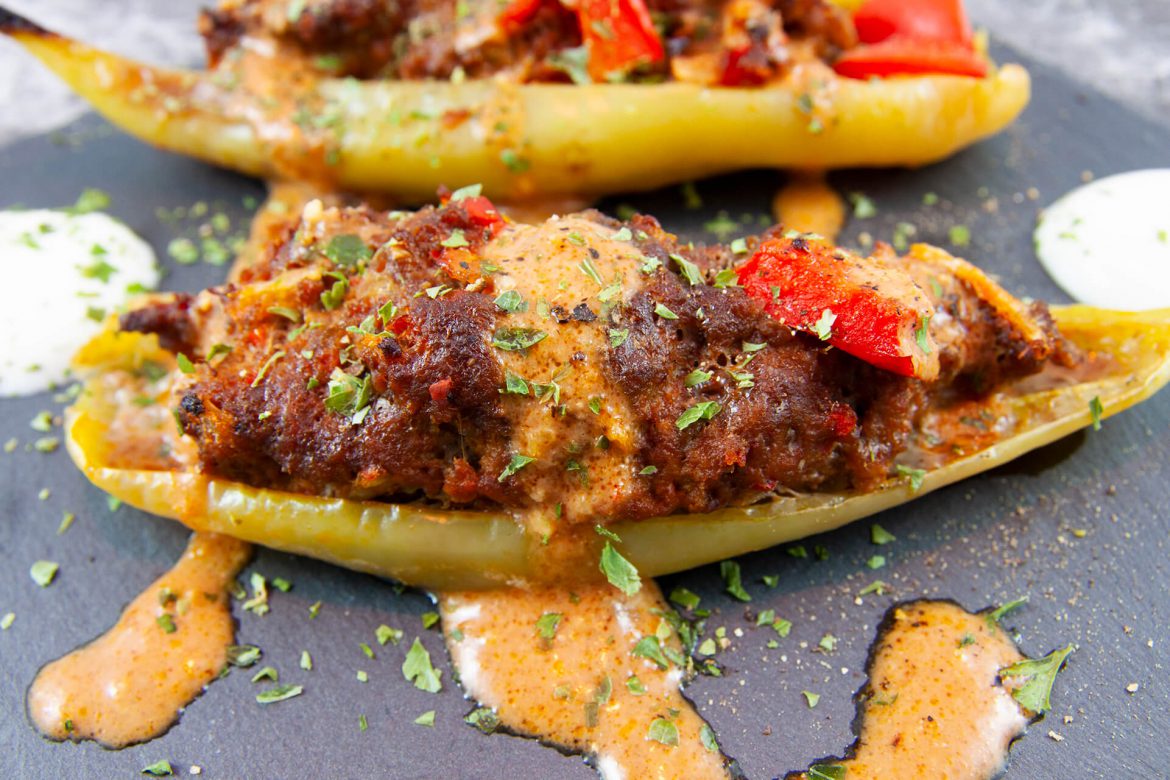 Im Gegensatz zu dem klassischen gefüllten Paprikarezept, ist dieses Gericht eine würzigere Variante mit ordentlich geräuchertem Paprikapulver und Ajvar. Also die volle Paprikadröhnung. Zusammen mit den Paprikastücken im Fleisch (optional), den Spitzpaprika als Füllmedium und, wenn ihr mögt, noch ein paar Jalapenostreifen oben drüber, haben wir dann mal locker 5 unterschiedliche Varianten Paprika in einem Gericht vereint. Nicht schlecht was? Ich empfehle zu diesem Gericht eher Rinderhack als gemischtes, da es mit seinem kräftigeren Geschmack nicht zu stark durch die anderen Aromen dominiert wird.