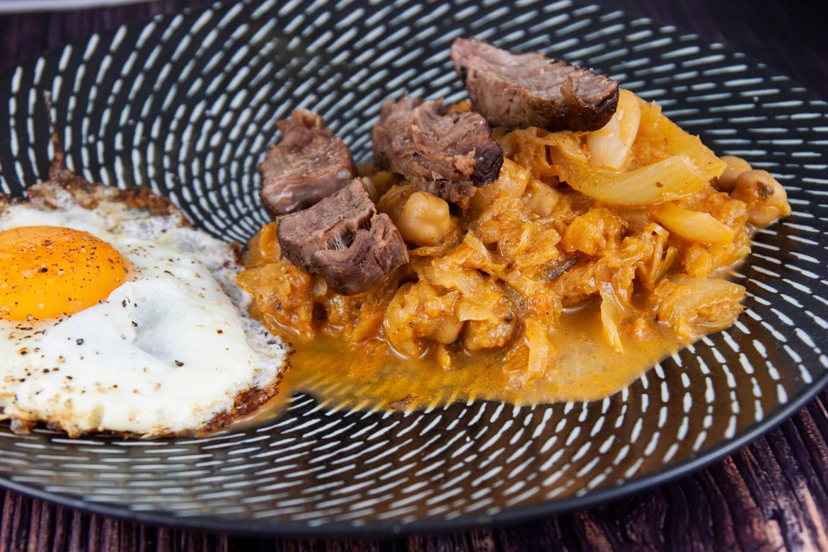 - Mit dem Sauerkraut und den grob abgetropften Kichererbsen ablöschen. Die Tomatensauce hinzugeben.